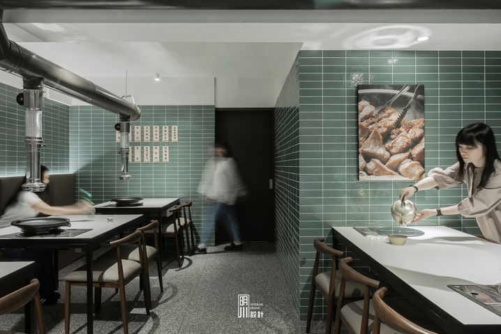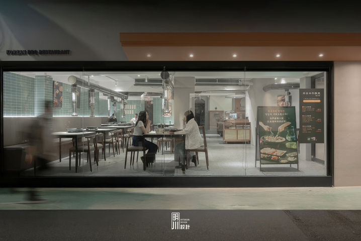 空間設計延續首爾街頭熟悉的元素──金屬排煙管、凹面磁磚、開放式明火烤爐,不刻意掩蓋功能,而是讓「吃燒肉」這件事回歸熱氣與人聲交織的真實場景。